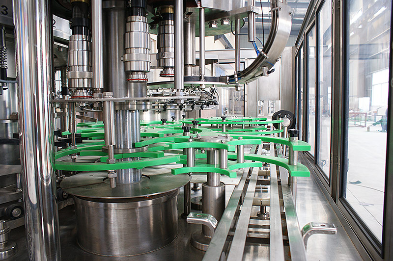 灌装机。进入灌装机的瓶子由瓶颈托板卡住瓶口保持,通过升降机构在凸轮作用下实现下降与上升。灌装采用重力灌装方式,瓶口上升顶开灌装阀完成灌装过程,灌装结束后瓶口下降离开灌装阀。瓶子通过卡瓶颈过渡拨轮进入旋盖机。旋盖机上的止旋刀卡住瓶颈部位,保持瓶子直立并防止旋转。旋盖头在旋盖机上保持公转并自转,在凸轮作用下实现抓盖、套盖、旋盖、脱盖动作,完成整个封盖过程。成品瓶通过出瓶拨轮从旋盖机传送到出瓶输送链上,由输送链传送出三合一瓶装机。灌装设备采用封窗封闭,封窗高度高于设备高点,进、出瓶处留有适当的通道,封窗底部留有排风槽。